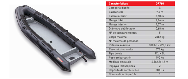 Embarcación Vanguard dr 760 diving con flotadores pvc color amarillo, depósito de combustible integrado de 300 lts, consola central con dirección , cofre/respaldo 2 pl, arco luces inox con escalera de buceo, botellero 12 botellas.